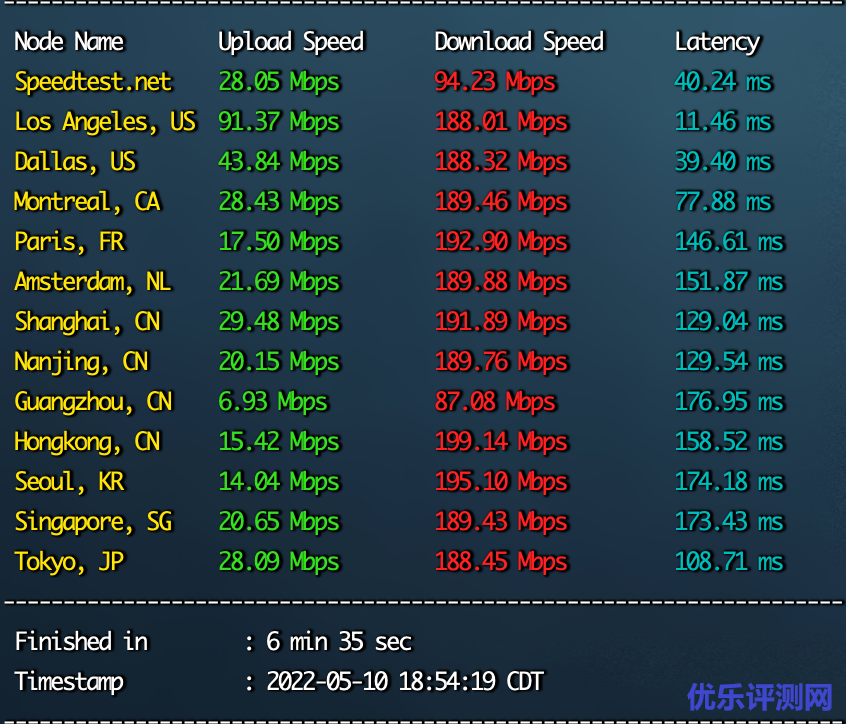 来测试下网络的上传和下载能跑到什么样子,第一个是就近节点,其他的是国内三网的节点,我们基本上可以看到这个100M带宽的机器在测试中国内不少地方上行都是接近跑满的状态、下行带宽貌超过了官方写的100Mbps有点儿像200Mbps了: