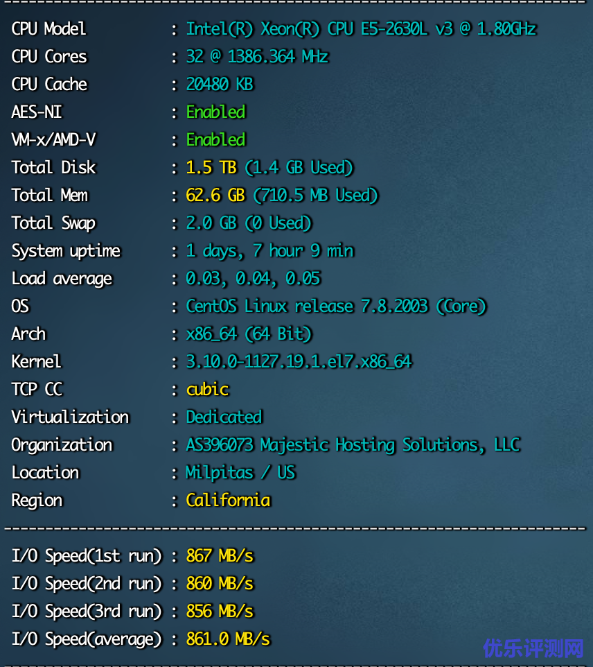商家提供了一个CPU型号2*e5-2630LV3(16核32线程,主频1.8GHz),硬盘当前I/O大致/s: