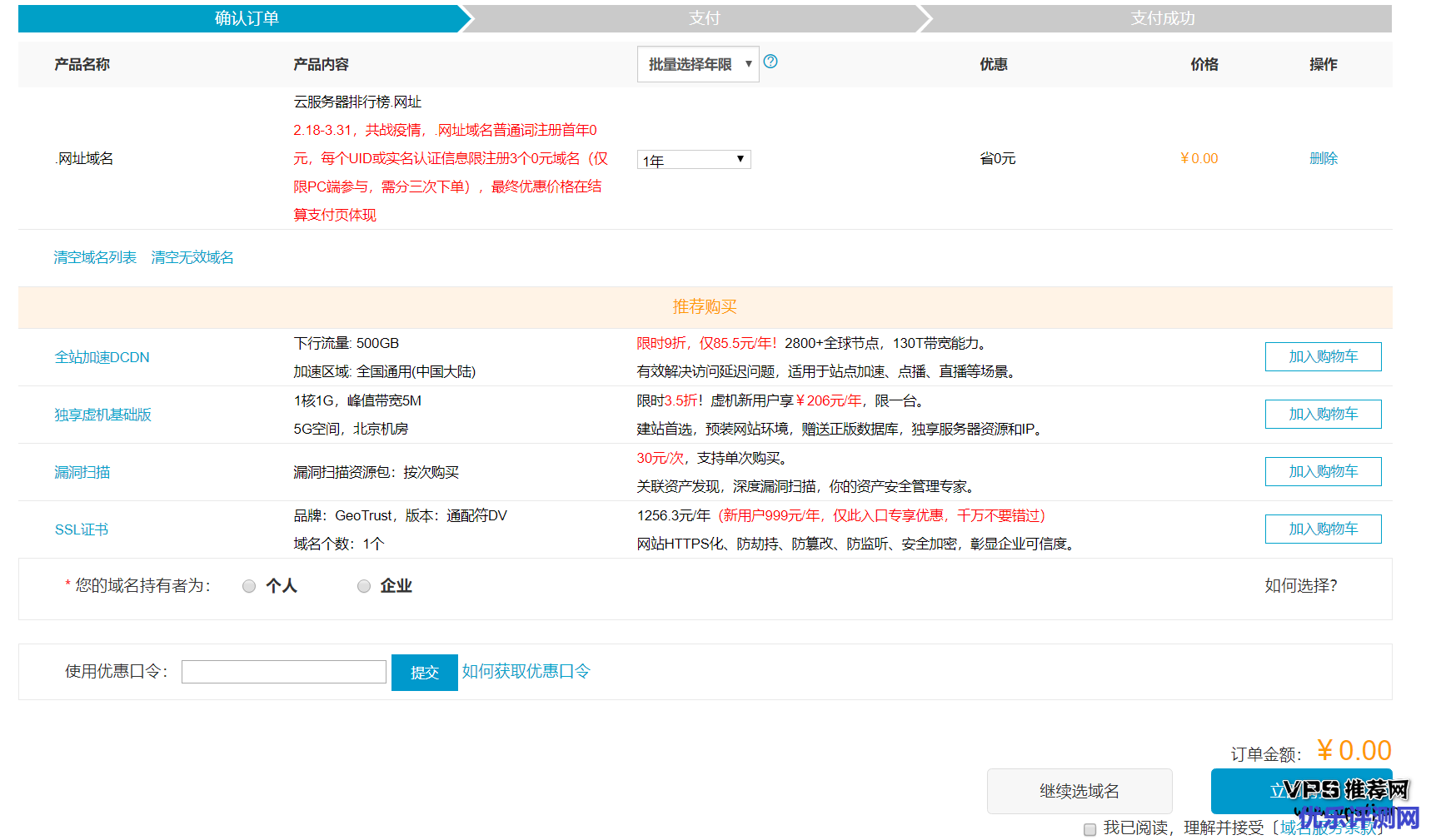 打开活动页面,选择.网址后缀域名,每个ID限注册3个,仅限PC端参与,需要的同学可以参与注册。不过听群友反应续费可不是一般的贵噢,大概2300左右,免费上次一年,这个随意玩玩。