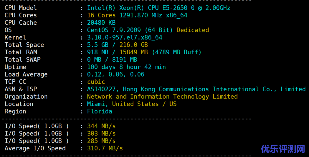 测试机器:CPU为e5-2650、16G内存、240G SSD、10M带宽、3个IPv4,当前售价900元/首月。平均硬盘I/O在310MB,IP是香港联合国际通讯有限公司AS下的。