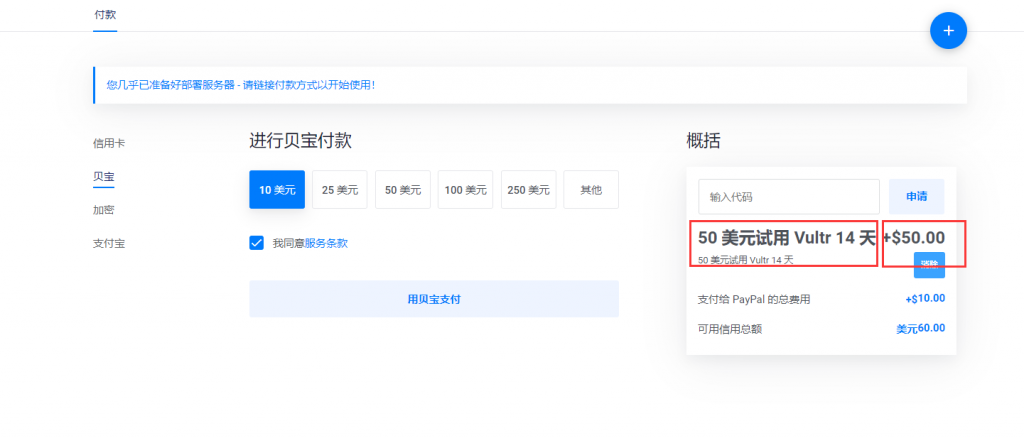 Vultr虽然支持支付宝付款,但是很多优惠活动是不能使用支付宝的,或者是使用支付宝后没有优惠。如果没有信用卡,那么建议注册一个Paypal账号【注册地址】,选择个人账户就行,可以绑定国内银行卡。