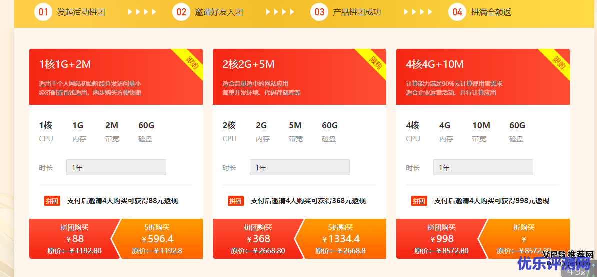 此次活动全场BGP五折购买,不限时长,拼团享受低至88/年,拼团完成后全额返还金额!