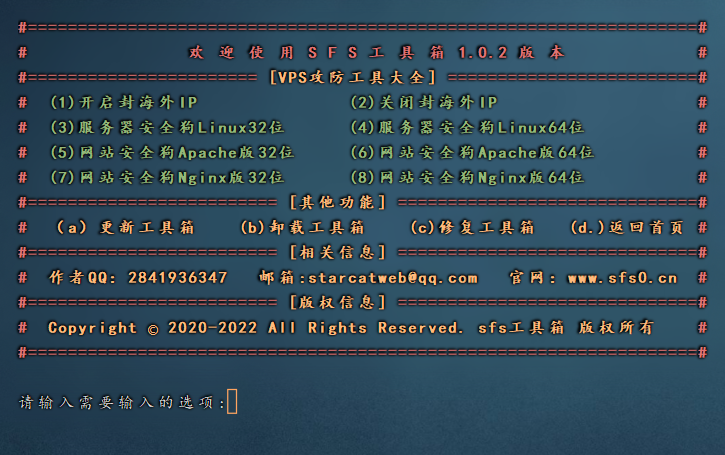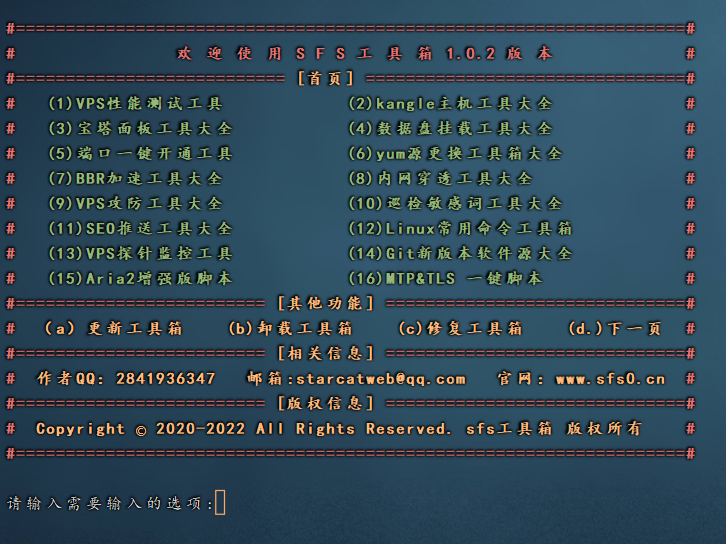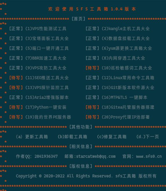 1.首页功能菜单 VPS性能测试工具(菜单内功能脚本多达数是个) kangle主机工具(采集彩虹正版同步) 宝塔面板工具(菜单内功能脚本多达数十个) 数据盘挂载工具(功能丰富完美适应各种系统要求) BBR加速(功能齐全自由选择) 内网穿透工具(集成网络最火内网穿透工具一键自动安装脚本) VPS攻防工具(功能多达数十个自由配置一键自动化部署) 巡检违规词系统(巡检服务器/web内敏感词并拦截自定义拦截页面邮箱提示) SEO推送工具(集成多个终端自动爬站点url并且推送各大搜索引擎) Linux工具箱(集成多个快捷常用命令脚本) VPS监控探针(集成多个性能不错的探针系统并且一键自动化部署) Git软件源(集成全国Git软件源一键自动化脚本) Aria2自动化一键部署脚本 更多功能请前往SFS工具箱http://www.sfs0.cn查看更新代谢 工具箱每个功能菜单支持快捷启动 融洽各种Linux系统