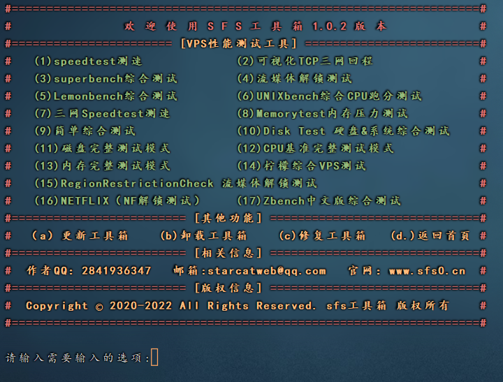 SFS轻量级Linux工具箱是一款免费运维工具箱, 工具箱内集成一键自动化处理脚本与半自动化处理脚本, 快捷启动工具与菜单方便快速访问执行。 工具箱脚本存储于国内服务器,每个功能执行速度提升无需等待, 简洁易懂的工具箱首页面板数字化执行命令, 多样化功能菜单提升Linux运维效率 一键自动化脚本安装无需分布式部署 轻量级工具箱占用内存低于1M扩展性能强大 每个功能代码专业人员审查处理 无任何木马病毒破坏计算机代码 无任何漏洞侵占用户数据行为 部分功能来源于网络搜集 部分功能来源于个人开发魔改 部分功能来源于投稿合作