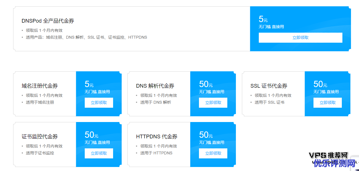 最近发现腾讯云及旗下dnspod有域名注册活动,可以免费弄一些优惠券,一起三张5元无门槛优惠券,用这三张可以注册.top,.xyz,.icu后缀的域名,不花钱,当然你也可以用他来折扣其他的域名注册,还是比较划算的。