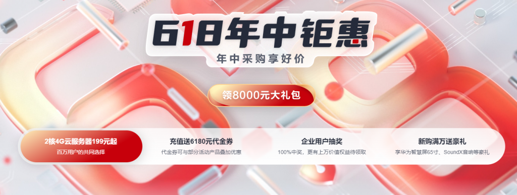 目前,华为云618活动充值即送6180元代金券,代金券可与部分活动产品叠加优惠;企业用户抽奖活动,100%中奖,更有上万价值权益等你领取;新购满万送豪礼,享华为智慧屏65寸、SoundX音响等豪礼等你领取!