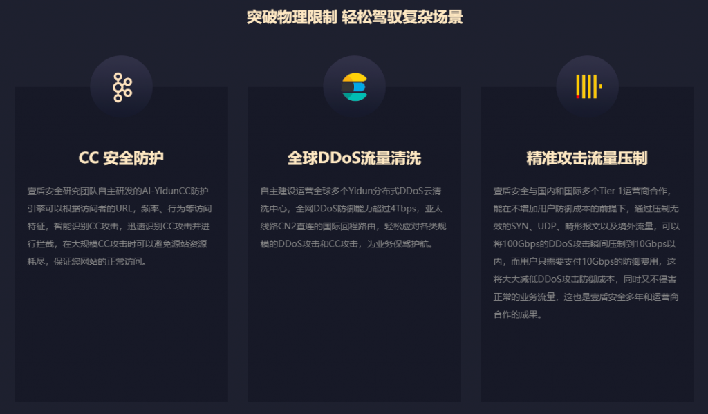 壹盾安全成立于2021年,隶属于上海玥悠悠云计算有限公司(Yyyisp),是一家新国人IDC商家,且正规持证/CDN,商家主要提供数据中心基础服务、互联网业务解决方案,及专属服务器租用、云服务器、云虚拟主机、专属服务器托管、带宽租用等产品和服务。自主建设运营全球多个Yidun分布式DDoS云清洗中心,全网DDoS防御能力超过4Tbps,亚太线路CN2直连的国际回程路由,轻松应对各类规模的DDoS攻击和CC攻击,为业务保驾护航。虽然成立不久,但已有企业级客户将网站和应用托管在Asiayun旗下的壹盾安全平台上,还是一个值得信赖的品牌的。