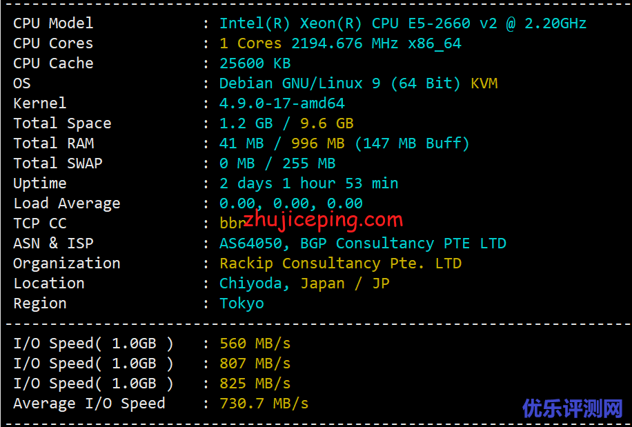拿到最低配香港vps,看到CPU是e5-2660v2(2.2GHz)主频,硬盘I/O还行有730MB/S的样子,根据本人的习惯顺手开启了BBR: