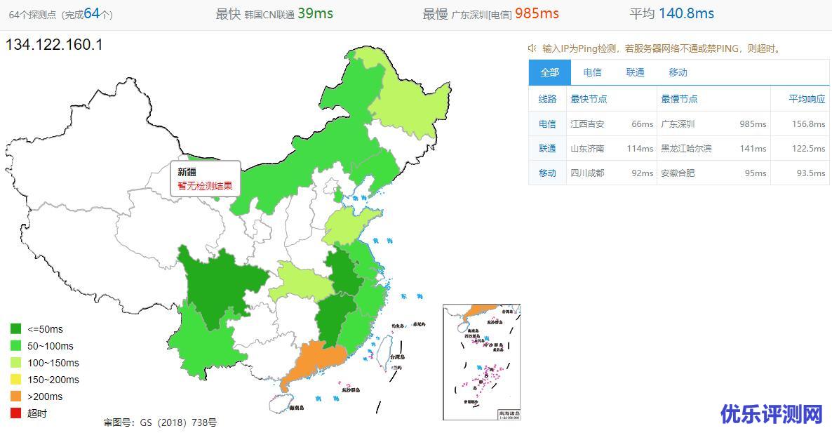 可以看到全国平均延迟在140ms左右,意向不到的是居然移动网络表现是最好的。