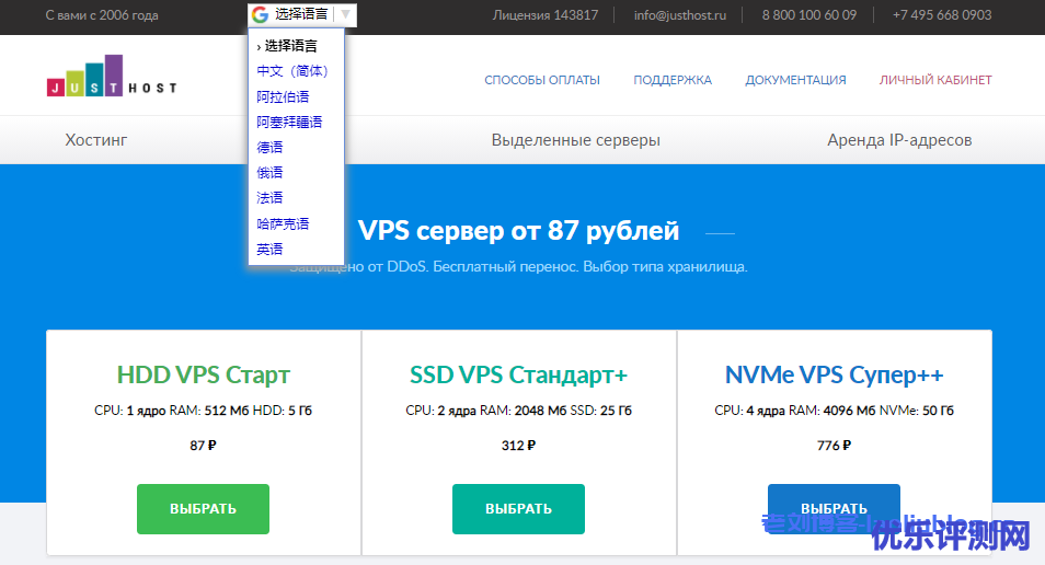 JustHost官网只有俄文版,自带Google翻译插件,可以翻译成中文或者英文。JustHost支持PayPal和支付宝付款,购买起来还是比较方便的。