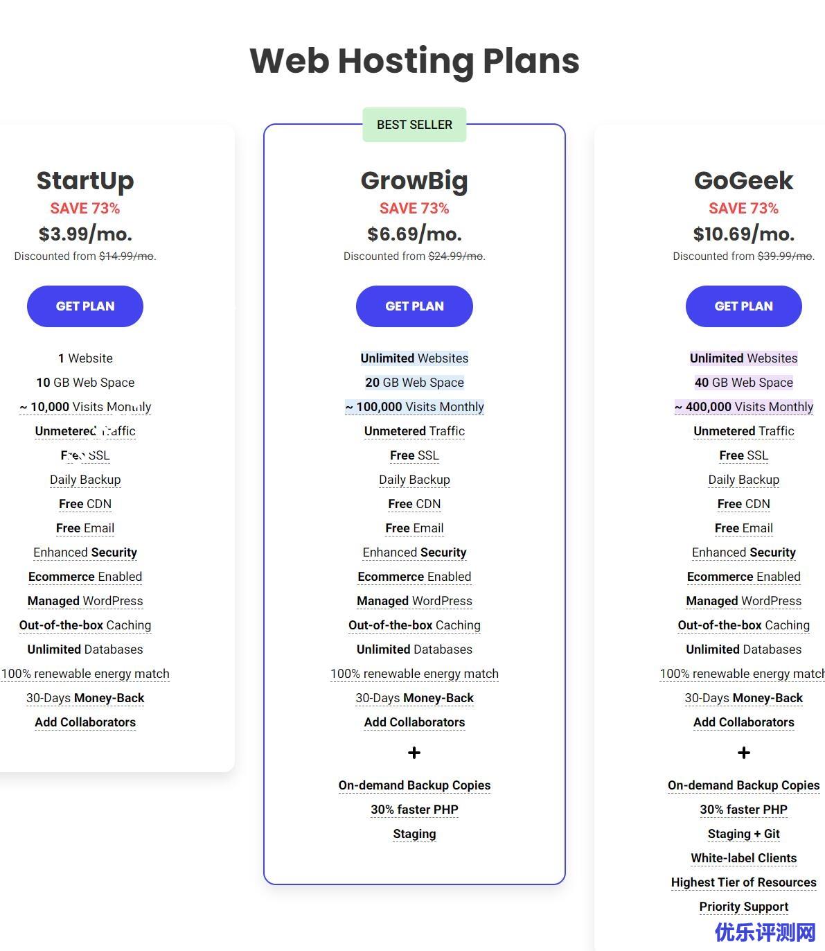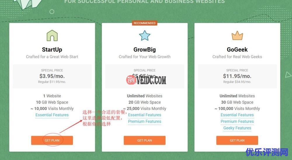 每种类型都有3种类型的套餐:StartUp、GrowBig和GoGeek。代表着不同的配置选择,简单理解技术:初级、中级、高级。 以新手来说,只有一个网站搭建需求时,StartUp 入门方案是最好的选择。