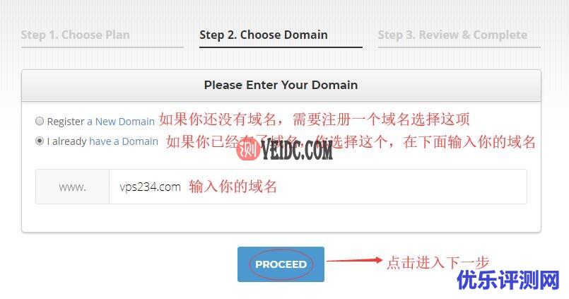 进入下一步后,就需要设置域名,如果你已经有域名了及不需要注册域名,没有就注册一个,然后点击“PROCEED”进入下一步,如下图所示: