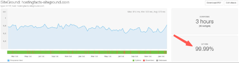 上图是监测的SiteGround主机24个月的正常运行时间,算是很完美的。