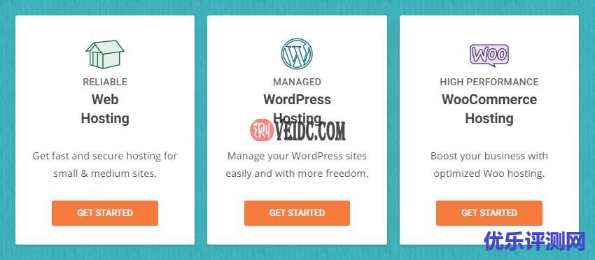 SiteGround进入官网首页,然后选择“Web Hosting”(这里我们前面说明过,你也可以选择WordPress Hosting或者是WooCommerce Hosting,看自己实际用途需要),点击“GET STARTED”进入下一步,如下图所示: