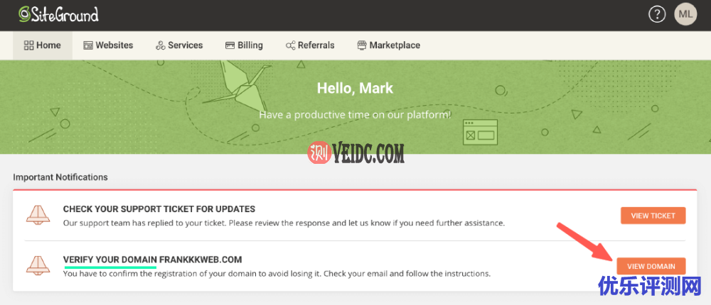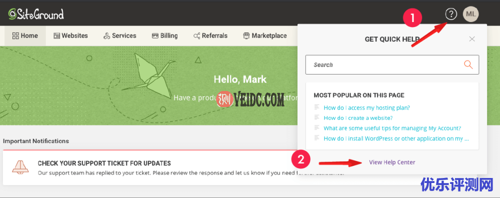 登录 SiteGround 后台,点问号标志 > View Help Center,前往帮助中心。
