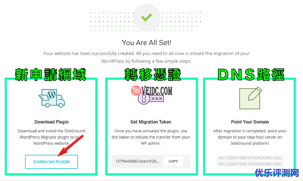 新主机空间安装完毕后,接下来需下载 SiteGround 提供的 SG Migrator 迁移插件(下图左边)。也请记得中间的 Migration Token,和右边的 DNS 路径,这页可先保存下来,等下都会用到。