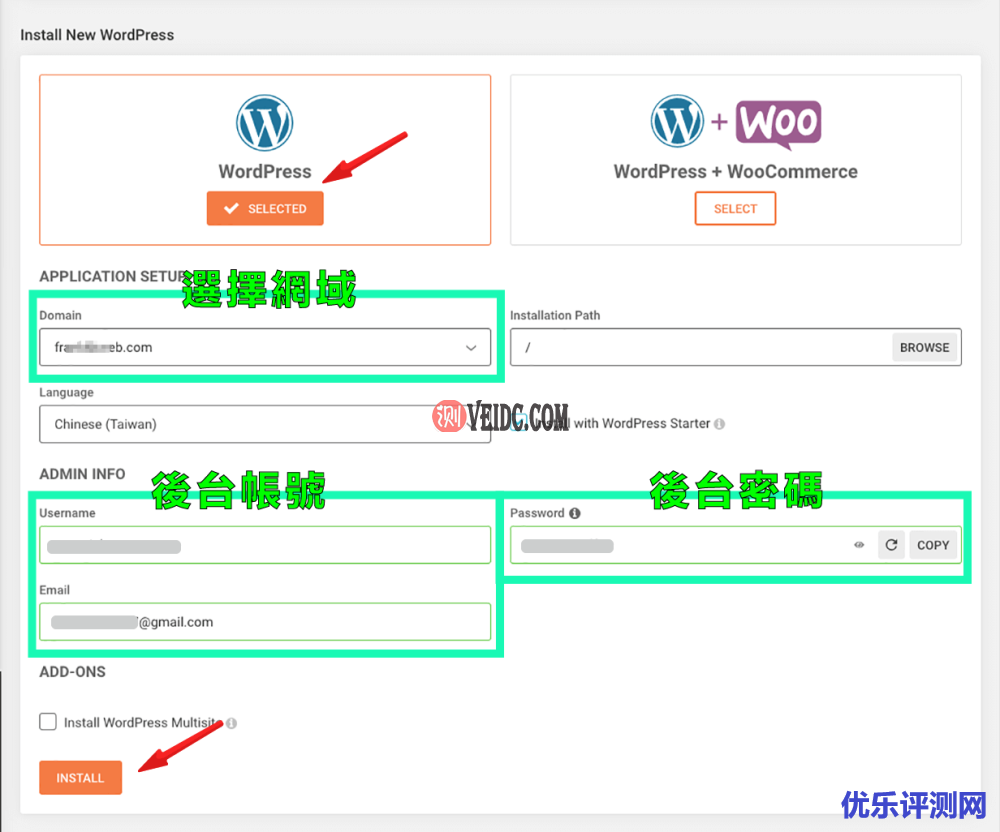 - 这里设置的帐号密码,是未来会用到的WordPress 后台帐密(之后可改密码,别担心)