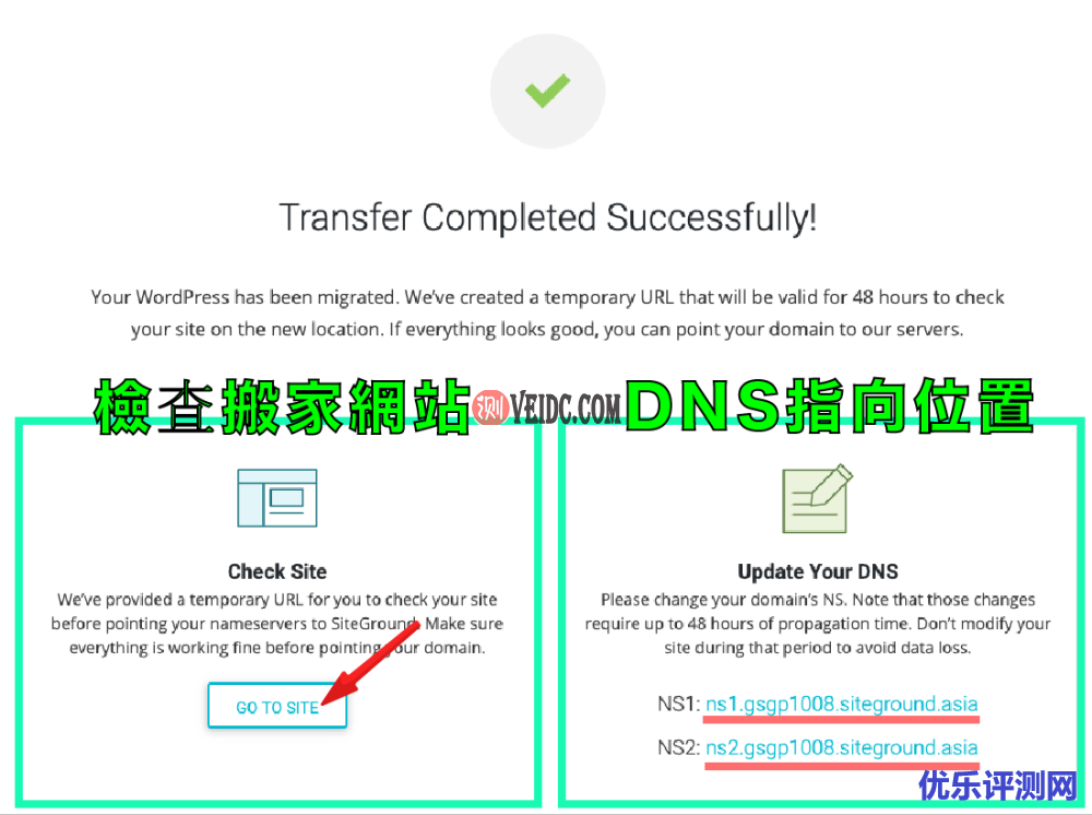 接着,可以点击下图左侧 Go To Site ,SiteGround 会给一个假网址,方便你确认迁移状况,如下图: