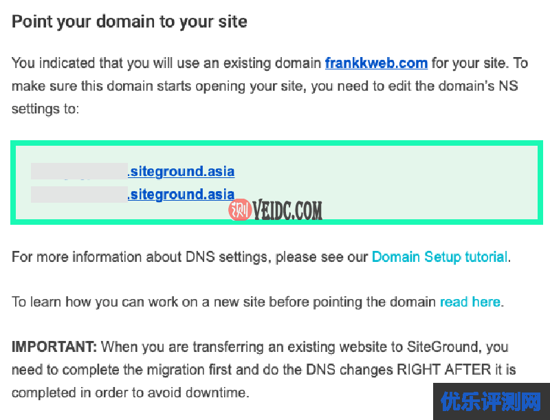 顺带一提:若转移完成后,SiteGround 会寄送一封通知信,传送到你刚填入的邮箱里,里面有 DNS 位置,若遗忘了可以来这查询。