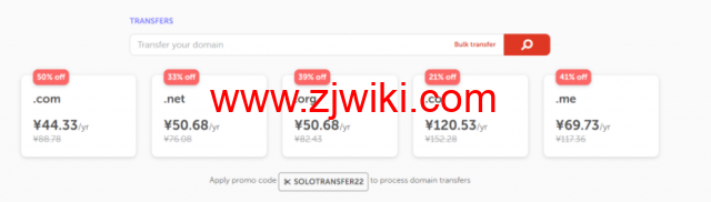 除了首年注册优惠外,Namecheap域名转移使用优惠码:SOLOTRANSFER22,购买也能享有较大的折扣,包括域名、域名、.co域名、域名、域名。
