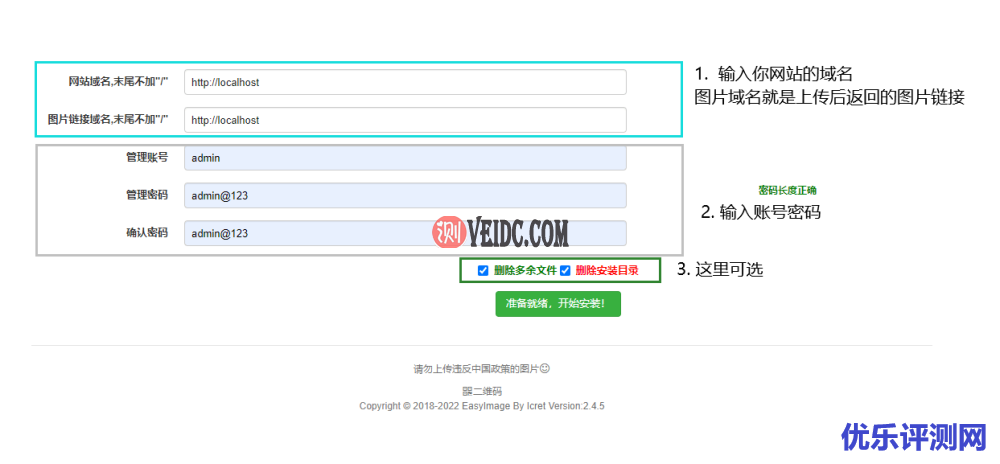 安装过程非常简单,下载好后,打开安装页面,添加网站名称和图片域名,即可上传图片。不需要任何伪静态支持,在Apache、Nginx均完美通过使用。