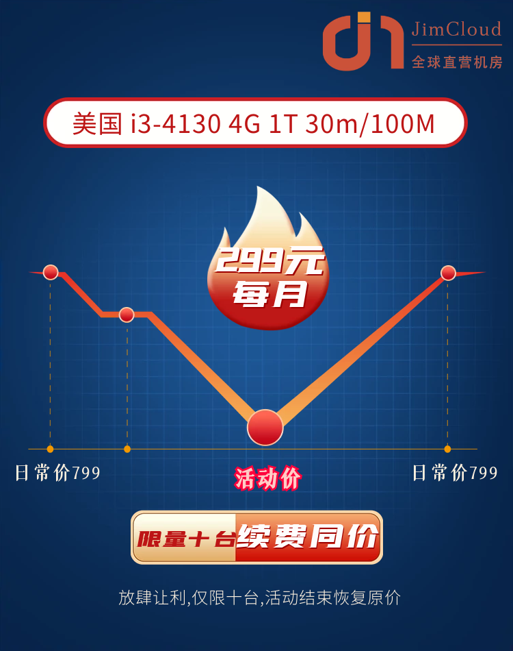 JimCloud美国上新,限时特惠!低价物理主机:/4G内存/1T-hdd 100M全向带宽/30M优化带宽,4月下单仅需299元,续费同价,数量有限。欢迎下单,更多优惠陆续上线
