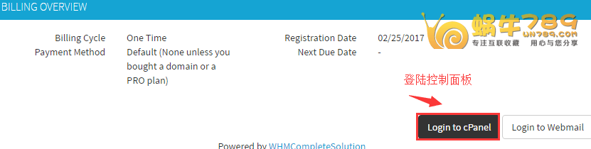 2、cPanel控制面板登陆。点击“>”按钮进入管理页面后,下拉到最下方如下图位置,点击“Login to cpanel”进入到cPanel控制面板。如果嫌弃这个方法麻烦,可以使用你邮件收到的控制面板登陆地址和账号密码登陆。