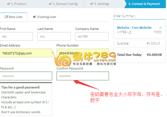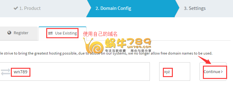 3、绑定域名。请选择“Use Existing”,填写自己的域名。域名一定要填写正确,应为只支持绑定一个域名,然后点击“Continue”继续。