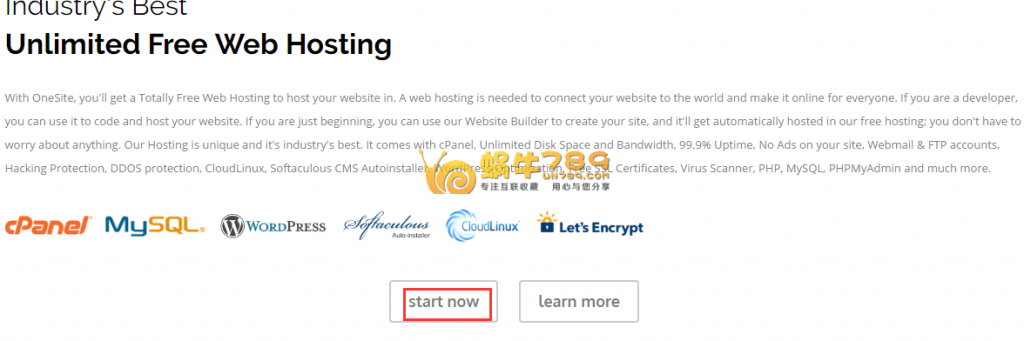 回到OneSite免费空间来,此免费空间提供无限磁盘和月流量。采用cPanel控制面板,提供免费MySQL数据库,支持绑定一个域名,支持FTP管理、PHPMyAdmin、免费SSL证书、DDOS保护等。申请无门槛,秒开通。