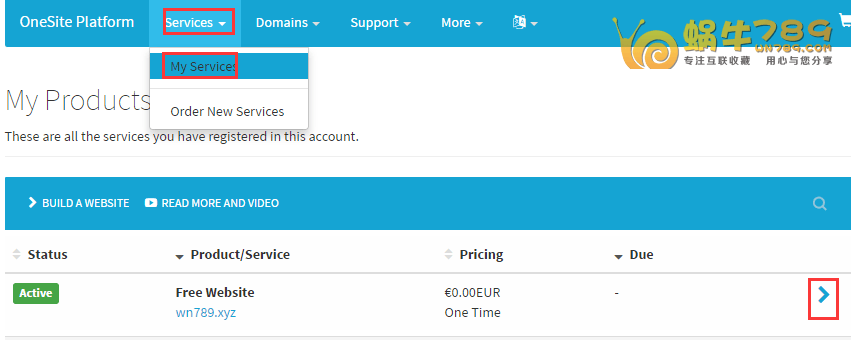 1、登陆OneSite后,点击“Services”中的“My Services”查看服务列表,可以查看到自己申请的免费主机,如果需要管理,请点击后面的“>”按钮进入管理页面。