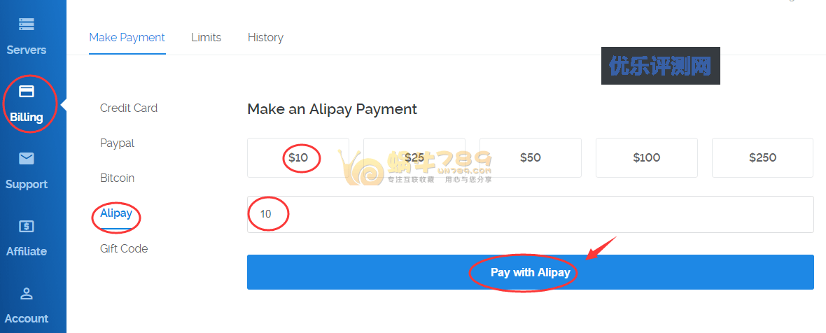 1、登陆Vultr后,点击右侧的“Billing”进入到财务管理页面。如果选择支付宝,就选择“Alipay”填写充值金额即可,最低10美元起步,目前汇率是 1.00 USD = 6.64552000 CNY。