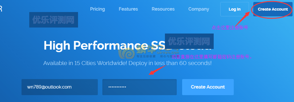 1、点击这里进入到Vultr官网,填写注册邮箱和密码完成注册。填写密码时要注意,密码必须有大小写字母、数字。