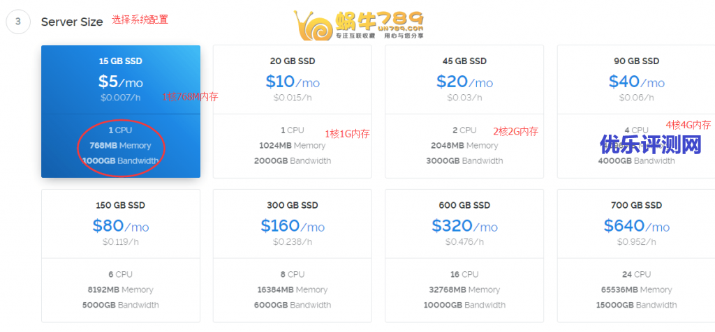 4、选择VPS配置,最低1核768M内存起。