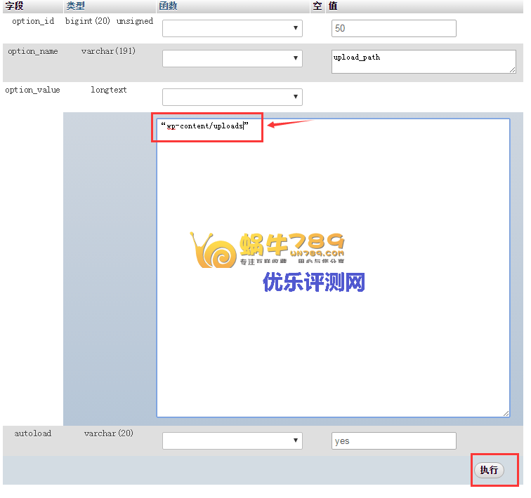 3、添加“wp–content/uploads”,记得要把引号也复制进去。点击“执行”更改完成修改。、