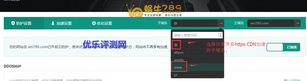 4、然后选择你要设置https CDN加速的子域名,根据自己需要甚至。我这里准备设置www和@。