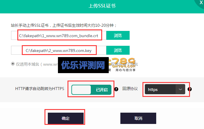 6、上传SSL证书。SSL证书需要是.crt和.key文件。如果不是请转换,也可以使用腾讯云的第三方SSL证书托管来生成。上传SSL证书后,一般10-20分钟内生效,未生效期间会出现暂时无法访问站点的现象。