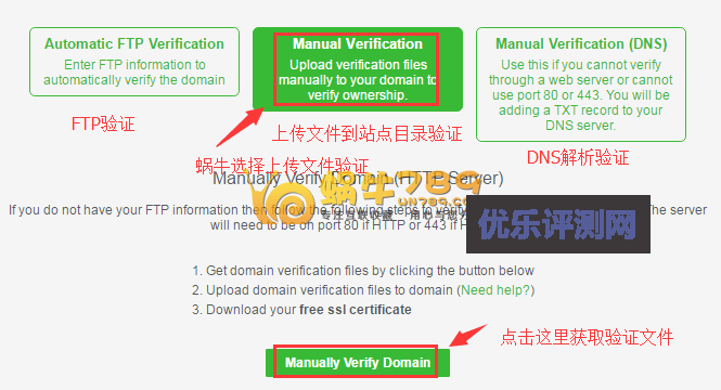 2、选择域名验证方式,有三种,依次是FTP验证、上传文件验证、DNS解析验证。这里蜗牛选择的是站点文件验证。然后点击“Manually Verify Domain”获取验证文件。