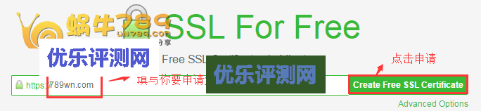 1、首先点击这里进入SSL For Free,然后填写自己将要申请免费SSL证书的域名(域名填写可以带www,也可以不带,因为系统会自动生成www域名和者不带www域名),再点击“Create Free SSL Certificate”进入到域名验证页面。