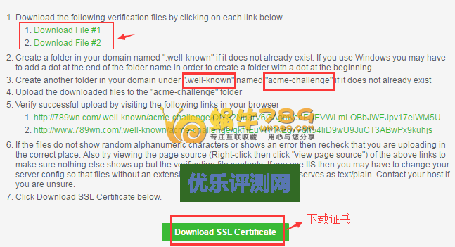 5、验证文件上传到站点目录对应文件夹后,点击“Download SSL Certificate”验证并生成SSL证书。