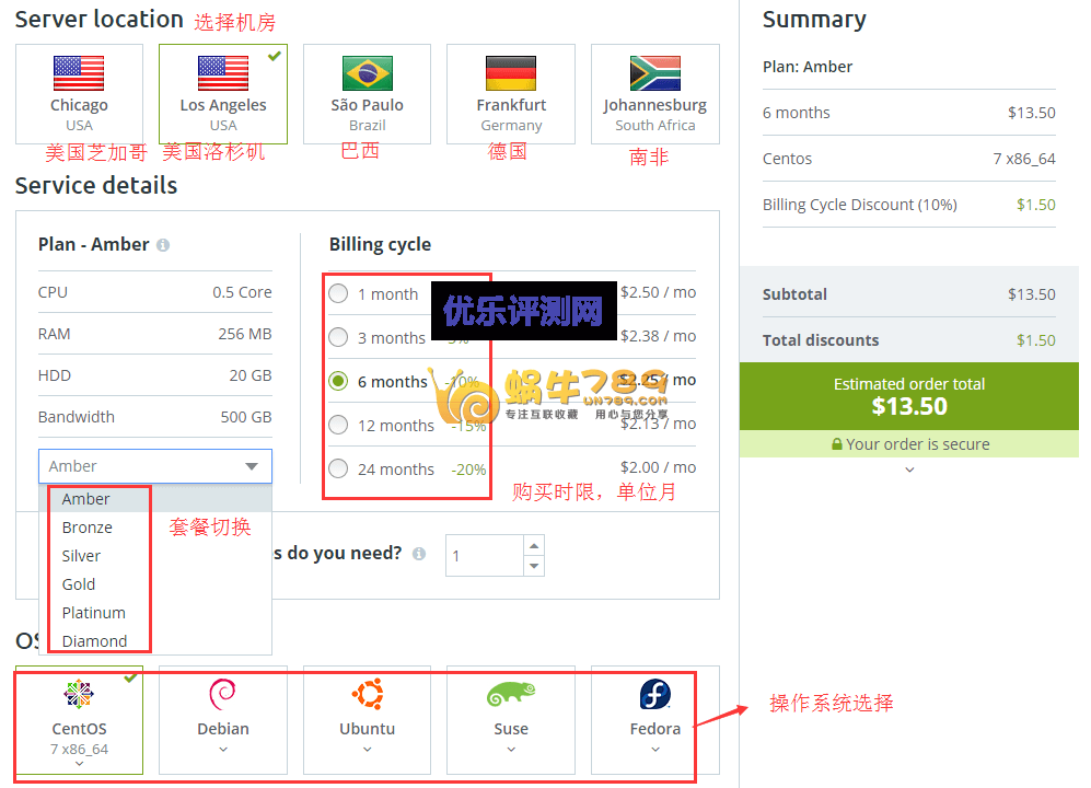 3、确认购买信息。在这里可以选择机房和更换套餐、VPS操作系统。及优惠码输入,关于如何输入优惠码请看下一步。