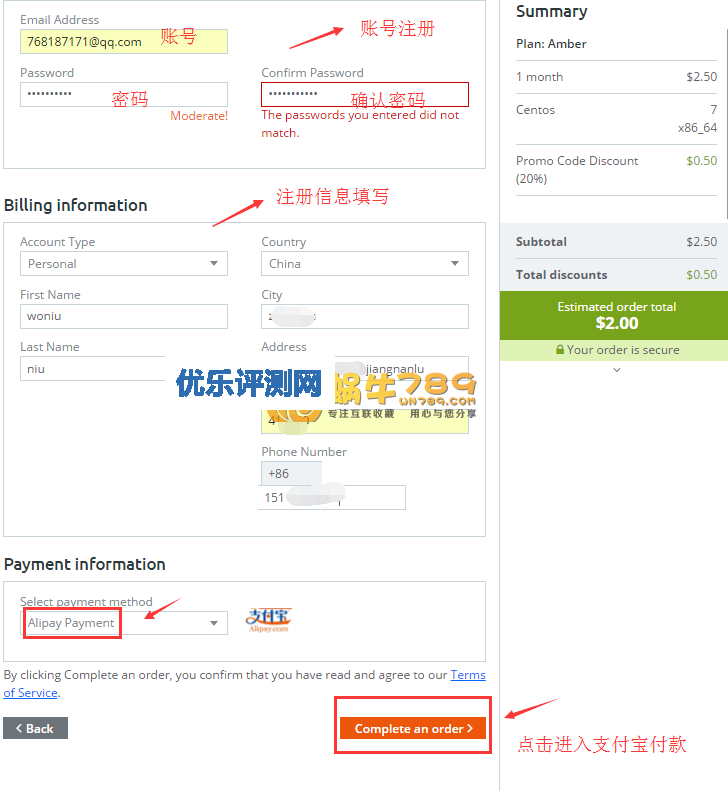 输入优惠码后下拉到如下图位置,点击橙色按钮进入到付款方式和账号注册信息填写页面。