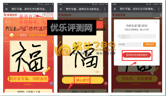 2、然后按下面三个图片流程帮蜗牛写福即可领取3天乐视*会员。这里需要注意的是,扫描上面二维码后微信会提示登录,我们进入到第一张图的页面后,如果登录的不是自己乐视*账号,请先点击更换成自己乐视账号,以免无法收到奖励天数。(注意:一定要登录是自己的乐视会员账号)