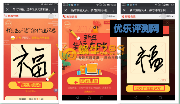 3、领取好三天免费会员后,点击“我也要集福”进入到活动页面,然后点击“我要集福”,写一个福字提交并发送你的好友帮忙集福。(注意:一定要登录是自己的乐视会员账号)