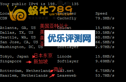 另外还可以使用一个脚本测试VPS在世界各地的下载速度,测试的地点依次是美国亚特兰大乔治亚州,