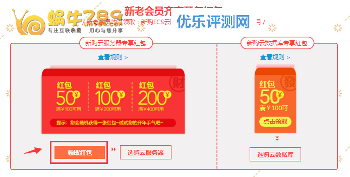 新老会员均可领取ECS云服务器和RDS云数据库满额可抵用 。ECS新购红包每个用户随机领取1张,红包限用于ECS产品包年包月新购预付费使用,共50、100、200三种面额,其中新购ECS满100用50,满200用100,满400用200;优惠力度还挺大的,等于半折优惠,但是红包不可与ECS年付优惠同享,不可与其他优惠叠加。红包不是每个账号都能抽取到,大家可以试试自己的手气。