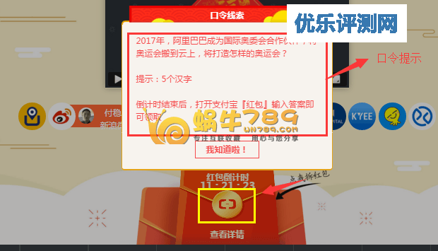 进入活动页面后点击下图黄框位置,查看下一期口令提示。分析出口令结果后每日10点整打开支付宝选择“红包”领取。2月7日这期的答案蜗牛已经知道了,这里偷偷告诉大家是“云上奥运会”,希望有网友能抢到红包。