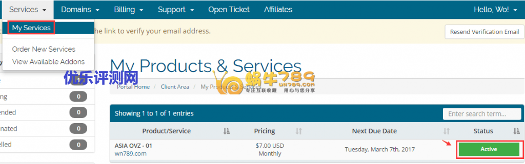 1、登录你的账号,点击“Services”的“My Services”进入服务列表,然后点击你要管理的VPS进入到管理页面。