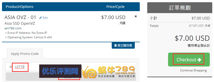 3、输入优惠码,点击“Checkout”进入到付款方式选择页面。