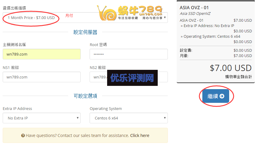 2、选择月付,填写域名和NS前缀,设置ROOT密码,然后点击“继续”。