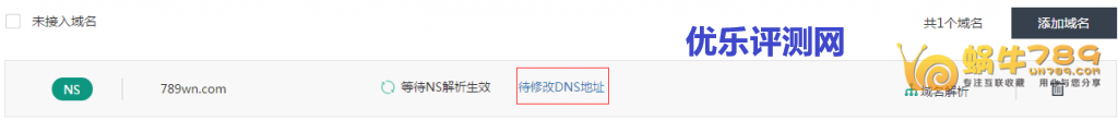 3、添加完成后点击导航栏的“域名列表”,回到域名列表,点击“待修改DNS地址”查看360网站卫士的DNS服务器地址